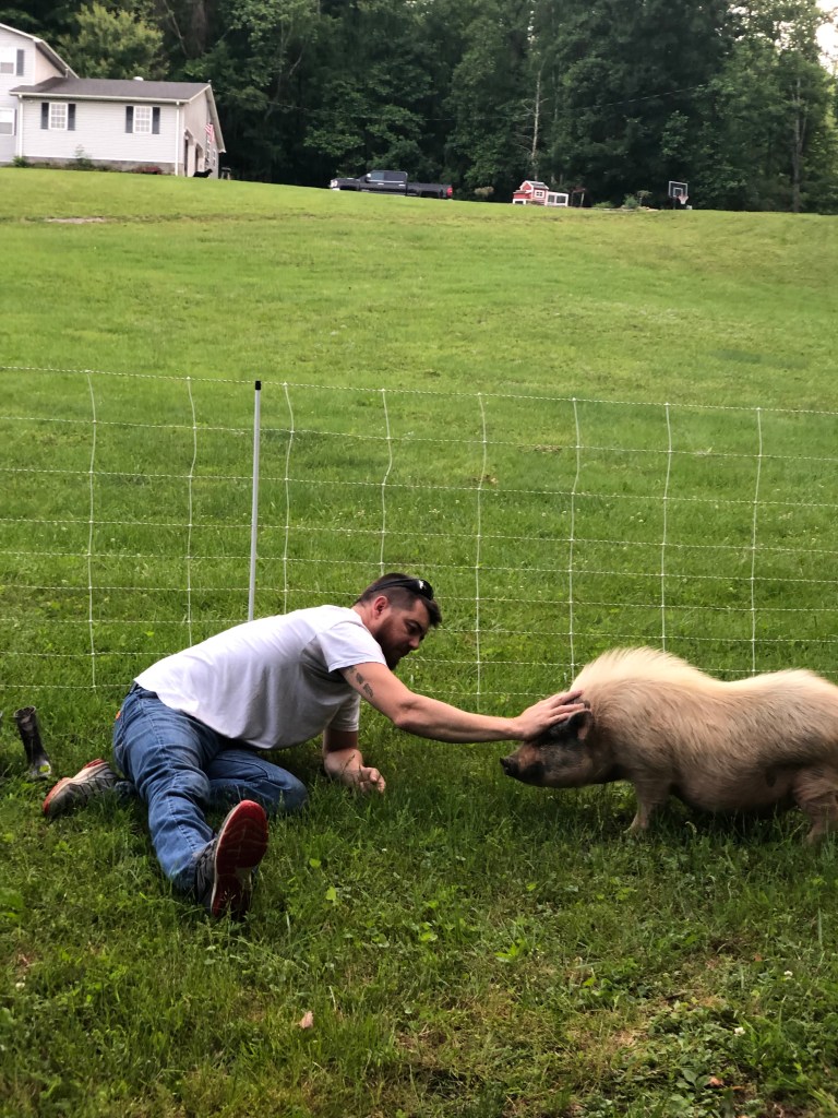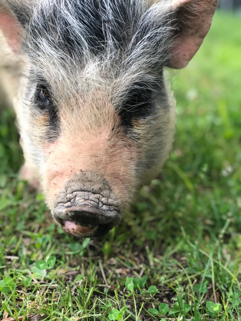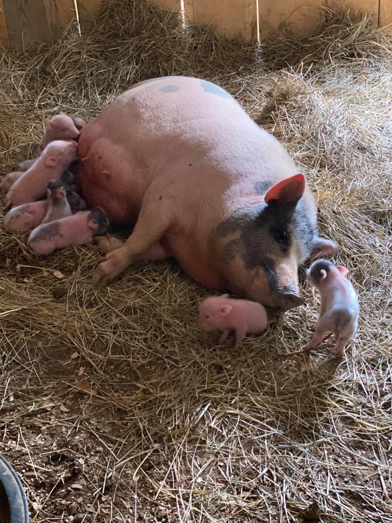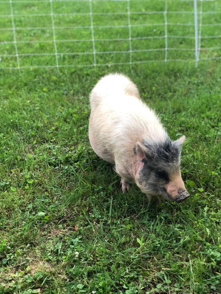 This is our Pot-belly female, Hippie. She has been a wonderful addition to the farm and has mothered 3 litters of piglets. She is an amazing mother! She is currently up for adoption. Please reach out for more information if you are interested.