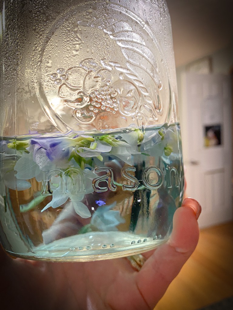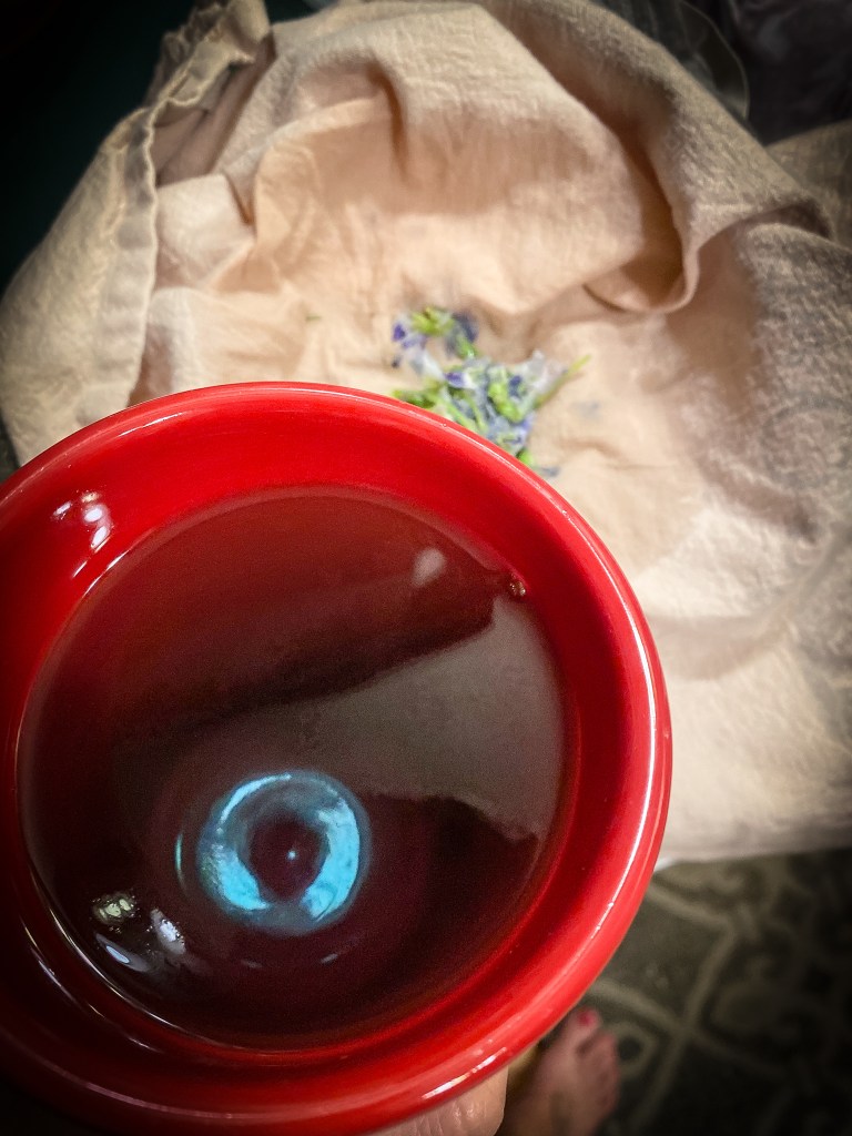 For my tea I boiled 2 cups of water and used about 1 cup of violets. I removed most of the green. I poured the boiling water over my violets and let it steep for about 10 minutes. I then took a cheese cloth and strained out the tea ( I wanted to eliminate the potential for any hitchhikers). I didn’t drink the entire cup of tea. I wanted to make sure it didn’t upset my stomach.